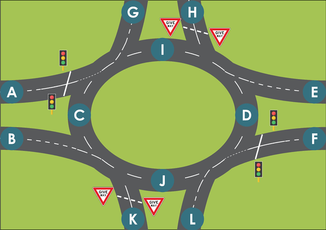 Before you say that I have to give way for any cars inside the round about, I don't think drivers (at least in NSW) do that, because if the car-from-A did go to L, I would have been waiting for nothing, and surely would never arrive at my destination.