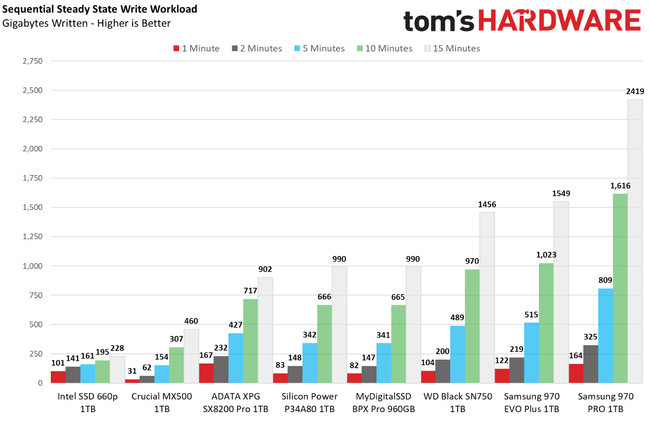 Tomshardware speed comparison between Silicon Power and 970 EVO Plus under various sustained write durations.