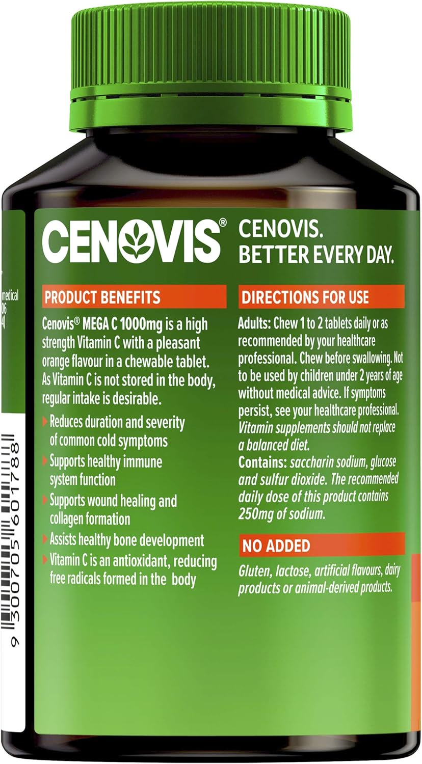 Cenovis Mega C is high-strength vitamin C that comes in a convenient, easy to take chewable tablet with a pleasant orange taste. It may assist in the management of colds by reducing the severity and duration of symptoms.