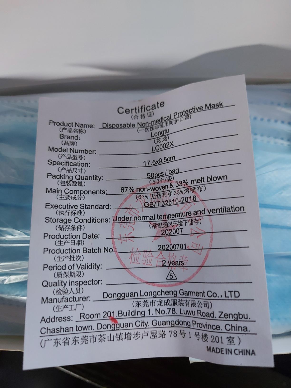 Brand is Longtu, manufacturer listed as Dongguan Longcheng Garment Co., LTD on the included certification slip that comes with it.