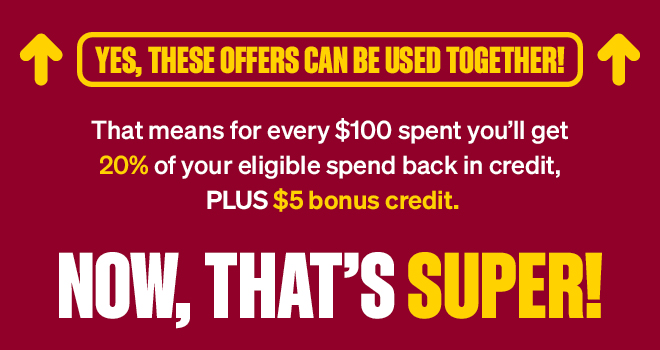 Stacks together with the current Get $5 for Every $100 Spend Promotion. See Terms of this promotion on the Spend and Get-a-thon page or PDF